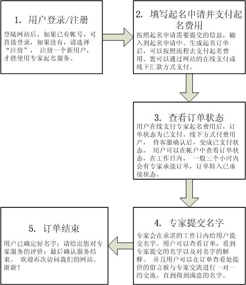 • 4. 用戶提交起名訂單,查看起名專家給出的名字,并與專家交互,確認成功等流程,都需要通過自己在美名騰注冊的帳戶中進行操作或提供的電子郵箱;