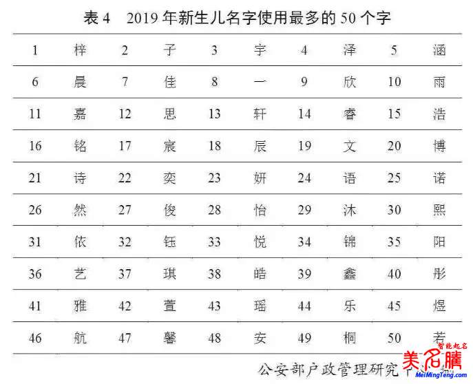 2019年出生并已經(jīng)進行戶籍登記的新生兒名字中,使用頻率最高的50個字依次為: