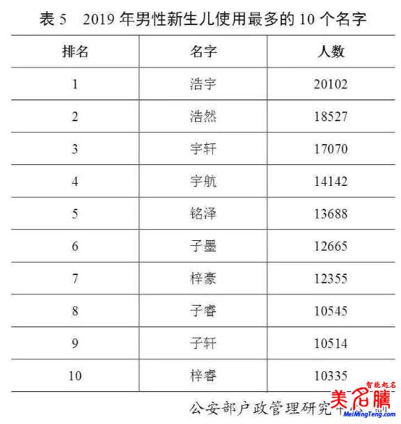 2019年出生并已經(jīng)進行戶籍登記的男性新生兒中,使用頻率最高的10個名字依次為:“浩宇”“浩然”“宇軒”“宇航”“銘澤”“子墨”“梓豪”“子?!薄白榆帯薄拌黝!?。與2018年相比,“銘澤”“子墨”“子?!薄拌黝!边M入前十。