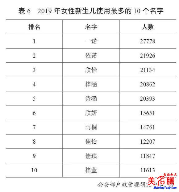 2019年出生并已經(jīng)進行戶籍登記的女性新生兒中,使用頻率最高的10個名字依次為:“一諾”“依諾”“欣怡”“梓涵”“詩涵”“欣妍”“雨桐”“佳怡”“佳琪”“梓萱”。與2018年相比,“佳琪”進入前十。