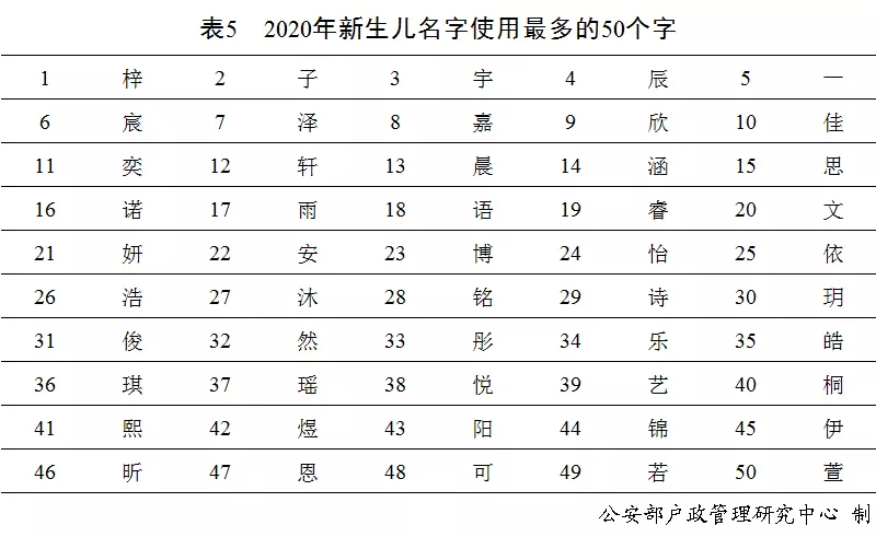 15、2020年出生并已經(jīng)進(jìn)行戶籍登記的新生兒名字中,使用頻率最高的50個(gè)字依次為“梓”“子”“宇”“辰”“一”等。16、與2019年相比,“玥”“伊”“昕”“可”等字受到新生兒父母的青睞。