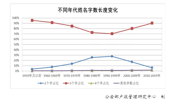 12、進(jìn)入21世紀(jì)后,“濤”“浩宇”“浩然”“婷”“欣怡”“梓涵”等“文藝范兒”的名字大受歡迎。13、從不同年代看,三字姓名一直占據(jù)主流。目前,三字姓名占比超過90%,二字姓名占比減至6.3%。14、四字及其他字?jǐn)?shù)姓名雖使用人數(shù)較少,但一直保持增長(zhǎng)態(tài)勢(shì),分別由上世紀(jì)五十年代的0.3%、0.4%提高到目前的1.6%和1.7%。