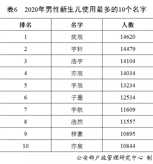 17、2020年出生并已經(jīng)進(jìn)行戶籍登記的男性新生兒中,使用頻率最高的10個(gè)名字依次為:“奕辰”“宇軒”“浩宇”“亦辰”“宇辰”“子墨”“宇航”“浩然”“梓豪”“亦宸”。18、與2019年相比,“奕辰”首次入圍并登頂榜首,成為男性新生兒父母起名的首選。19、2020年出生并已經(jīng)進(jìn)行戶籍登記的女性新生兒中,使用頻率最高的10個(gè)名字依次為:“一諾”“依諾”“欣怡”“梓涵”“語桐”“欣妍”“可欣”“語汐”“雨桐”“夢(mèng)瑤”。20、與2019年相比,“一諾”“依諾”“欣怡”依舊位列三甲,“語桐”“可欣”“語汐”“夢(mèng)瑤”進(jìn)入前十。