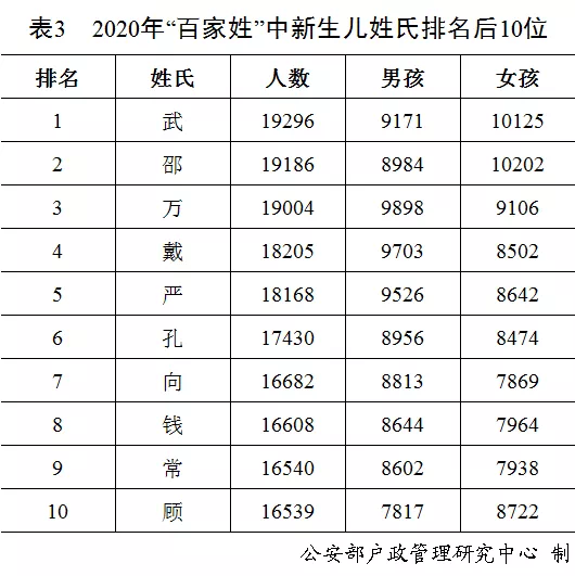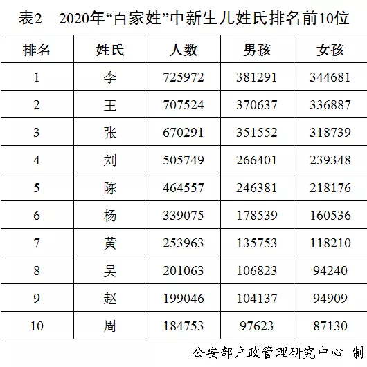 近日,公安部公布了2020年度全國姓名報(bào)告。你知道“百家姓”排名有什么新變化嗎?2020年新生兒最喜歡的名字又是什么?1、按戶籍人口數(shù)量排名,“王”“李”“張”“劉”“陳”依舊名列前五,五大姓氏人口總數(shù)占全國戶籍總?cè)丝诘?0.8%。2、2020年出生并已經(jīng)到公安機(jī)關(guān)進(jìn)行戶籍登記的新生兒共1003.5萬,其中男孩529.0萬,占52.7%,女孩474.5萬,占47.3%。3、2020年“百家姓”中新生兒登記姓氏最多的是“李”,共72.6萬人,最少的是“顧”,僅1.7萬人。