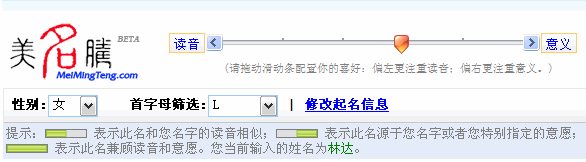 美名騰智能起名網(wǎng)的免費在線起英文名,是一個深受用戶喜歡的超酷在線起英文名實用工具。能夠根據(jù)中文名字的讀音起英文名,也能夠根據(jù)中文名字的意義起英文名,還能夠按照首字母起英文名。