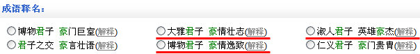 | 成語是自古至今形成的一些固定結(jié)構(gòu)和固定含義的詞組或短語,絕大多數(shù)都是四字格。很多父母當(dāng)初在為孩子起名時(shí),可能是通過成語精選出來的。此外,平時(shí)我們?cè)诮榻B自己名字時(shí),總希望別人能體會(huì)到該名字蘊(yùn)涵的文化氣息和高雅內(nèi)涵,從而給人留下更深刻的印象。把自己的名字通過一個(gè)或兩個(gè)成語解釋出來,就能達(dá)到這個(gè)效果。美名騰人名解析系統(tǒng)為您提供了強(qiáng)大的成語釋名功能,方便您為自己的名字選出最貼切的成語解釋。下圖顯示了“君豪”這個(gè)名字的成語釋名信息。 |