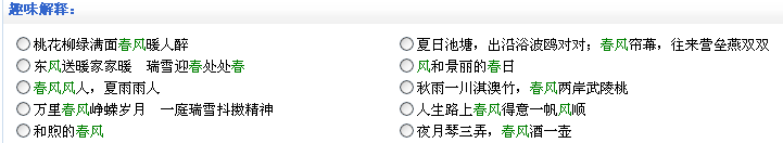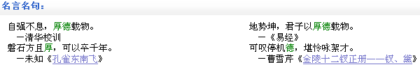 | 使用人名解析系統(tǒng),用戶可以找到一句最合適解釋自己名字的名言或趣解,方便在給別人介紹自己名字時(shí)使用,從而易于其他人記憶自己的名字。下圖分別顯示了名字“春風(fēng)”及“厚德”的趣解和名言信息。 |