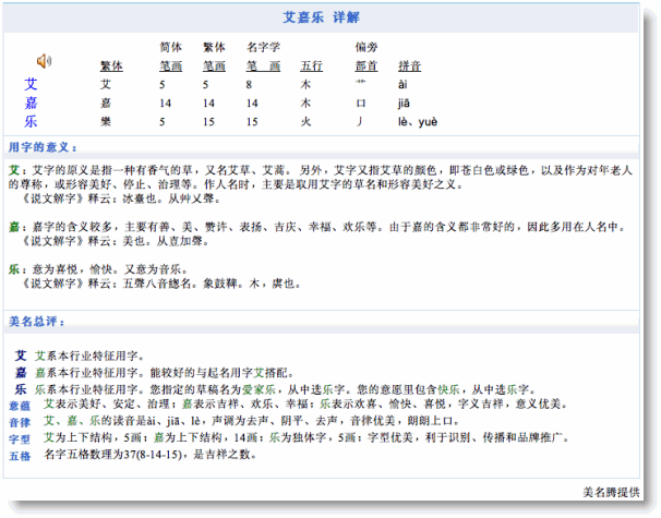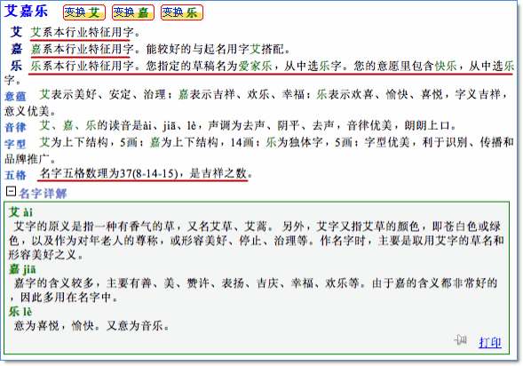 2、綜合分析輸入的起名信息,起出滿足條件的名字,如下是其中的一個(gè)候選名字