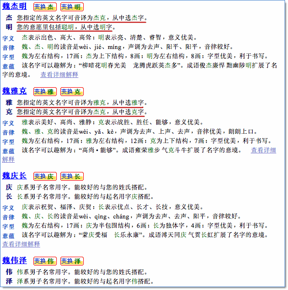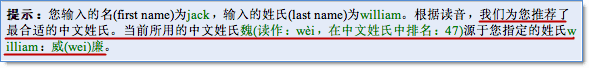 3、根據(jù)推薦的中文姓氏,以及輸入的英文名(先把名字音譯為中文名字),得到如下所示的中文本土名字。下面是部分候選名字