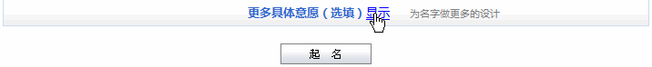 | 有時(shí),您可能不喜歡某些漢字或詞語,希望給孩子起名字時(shí)避諱掉這些漢字或詞語。美名騰寶寶起名系統(tǒng)為您提供了強(qiáng)大的避諱漢字或詞語的功能,來滿足您這方面的需求。要想避諱漢字或詞語,首先需要將“更多具體意愿”展開,如下圖所示: