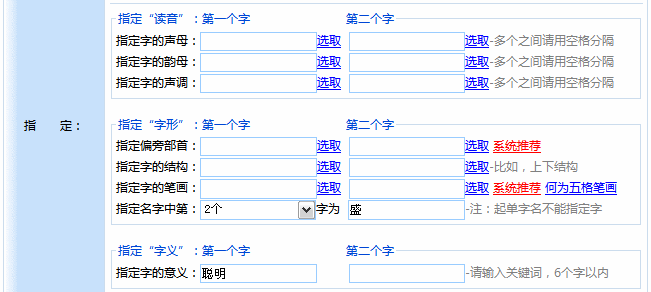 某些情況下,如果您希望在名字中彌補(bǔ)其他的五行屬性,從而使得起出的名字更符合您的心意??梢宰约簩?duì)五行進(jìn)行指定。有關(guān)這方面的信息,請(qǐng)參考:20. 怎樣根據(jù)需要指定想要的符合五行的用字?。