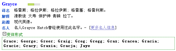2. 點(diǎn)擊“提交”按鈕,系統(tǒng)即可為您起出符合要求的英文名。以下是英文名“Grayce”的解釋信息。