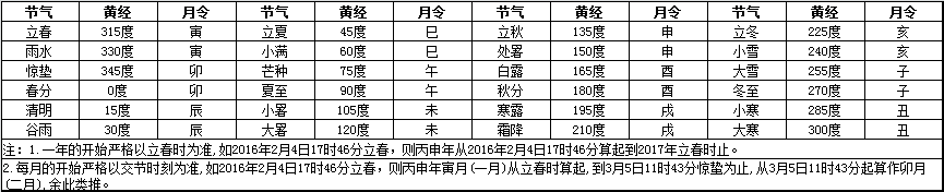 所謂二十四節(jié)氣是將地球繞太陽(yáng)一周即一回歸年的360度角劃作24分,即太陽(yáng)在黃經(jīng)在向東每移動(dòng)15度角為一“氣”,移動(dòng)一周360度共24氣,農(nóng)歷將這二十四節(jié)氣名為立春、雨水、驚蟄、春分、清明、谷雨、立夏、小滿(mǎn)、芒種、夏至、小暑、大暑、立秋、處暑、白露、秋分、寒露、霜降、立冬、小雪、大雪、冬至、小寒、大寒。其中立春、驚蟄、清明、立夏、芒種、小暑、立秋、白露、寒露、立冬、大雪、小寒等十二個(gè)稱(chēng)為“節(jié)氣”,其余的稱(chēng)為“中氣”。節(jié)氣通常被看作是陰歷,實(shí)際上卻是嚴(yán)格按回歸年計(jì)算的,屬于陽(yáng)歷的范籌。四柱排列中所用的年月劃分也是嚴(yán)格以節(jié)氣為標(biāo)準(zhǔn)的,而不是通常農(nóng)歷或公歷的年月劃分,這是起四柱的基本原則,使得四柱排列不受歷法變更的影響而保持其準(zhǔn)確性,更重要的是以回歸年為紀(jì)年標(biāo)志,符合四季寒暑變化的節(jié)律,遵循天道輪回的因果關(guān)系,而這些都是命理學(xué)的理論基礎(chǔ)。現(xiàn)將四柱年月支與節(jié)氣之關(guān)系列表如下: