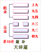 履卦乾上兌下,為艮宮五世卦。履為履行之意,又寓意禮,提示占筮者要兢兢戒懼,遵守禮節(jié),這樣才有驚無險。