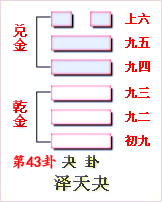 這個卦是異卦(下乾上兌)相疊。乾為天為??;兌為澤為悅。澤氣上升,決注成雨,雨施大地,滋潤萬物。五陽去一陰,去之不難,決(去之意)即可,故名為夬(guài),夬即決。