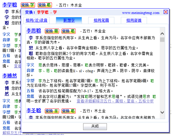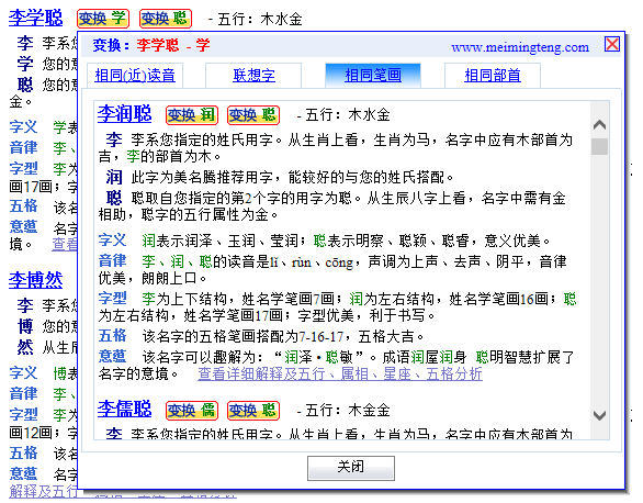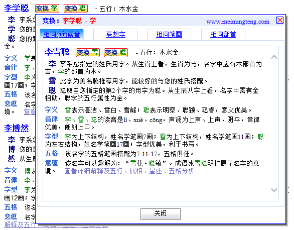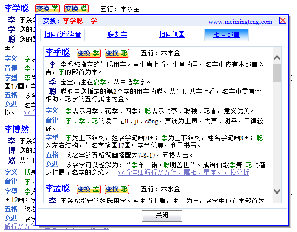 假設(shè)上面這個(gè)名字用戶覺得還不錯(cuò),但還不是那種十分滿足的類型。您可以點(diǎn)擊名字旁邊的變換按鈕。我們這里假設(shè)對(duì)“學(xué)”進(jìn)行變換,通過“同音、同(近)義,相同筆畫(姓名筆畫),相同部首”4個(gè)方面進(jìn)行變換可以得到如下名字: