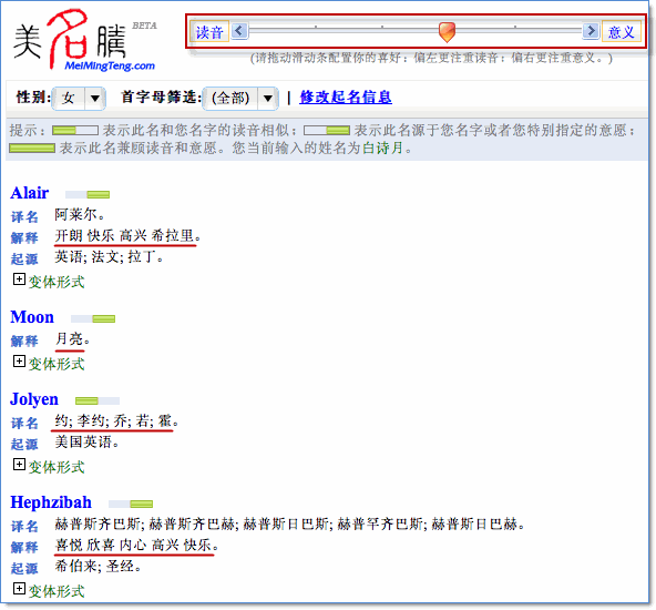 2、綜合分析輸入的起名信息,起出滿足條件的名字。美名騰可以根據您輸入的中文名字的讀音和意義,以及個性化意愿起名。如下是其中的一些候選名字